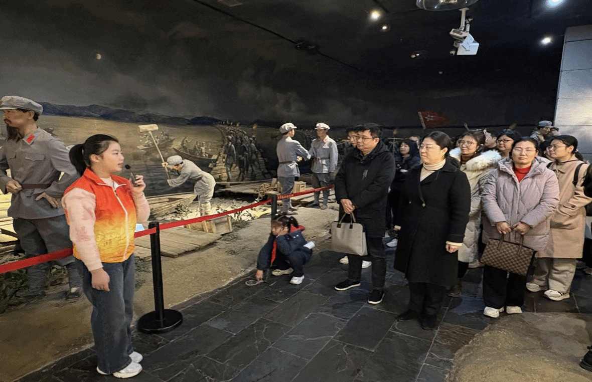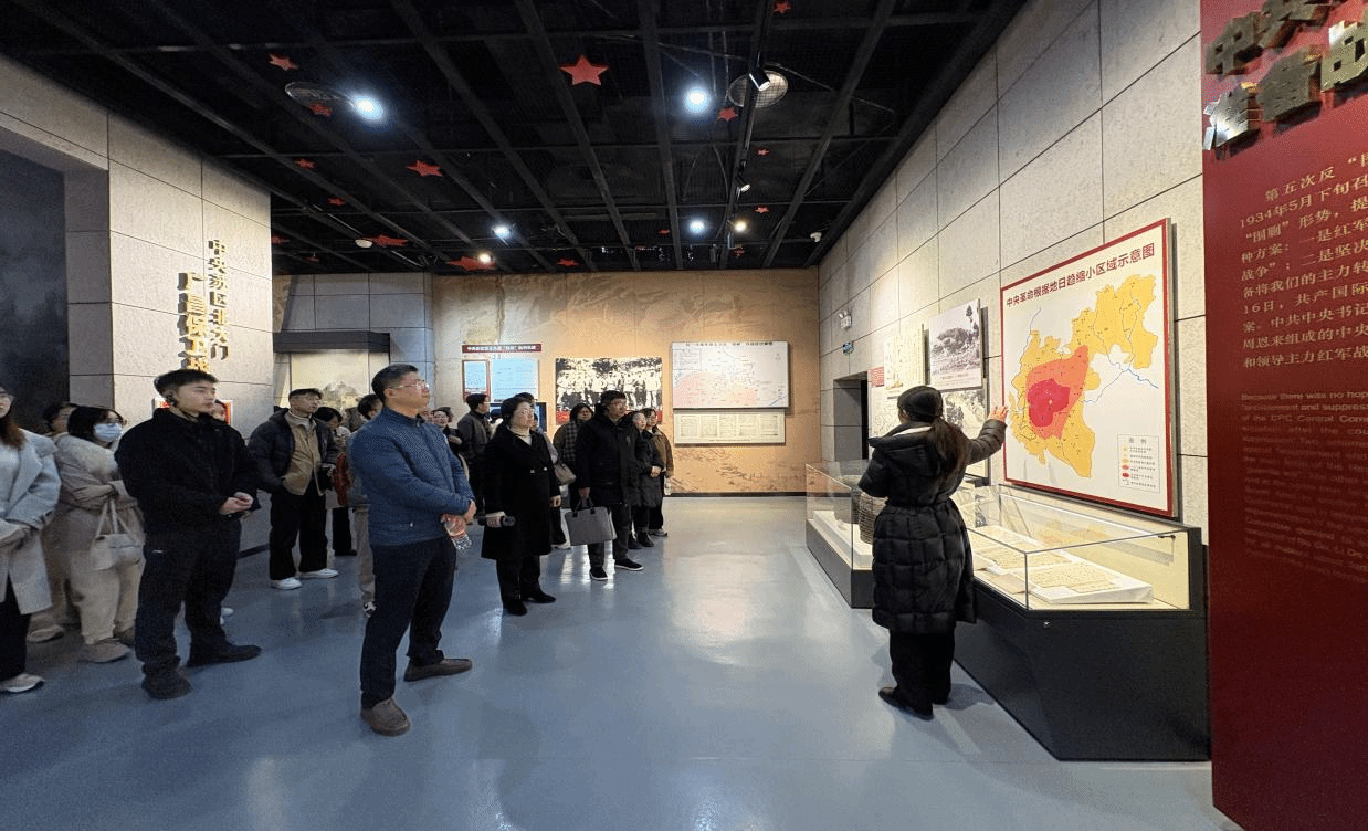 随后,一行人前往中央红军长征出发纪念馆进行参观。一张张泛黄的照片、一双双破旧的草鞋、一件件锈迹斑斑革命文物以无声胜有声的力量使得大家驻足观看;纪念馆还展示了于都人民无私奉献支援红军的鱼水深情,让党员同志深受感动。当讲解员讲到“最后一块板,拿去架浮桥”故事时,大家深深地被革命先辈的事迹震撼,纷纷感慨幸福生活的来之不易。