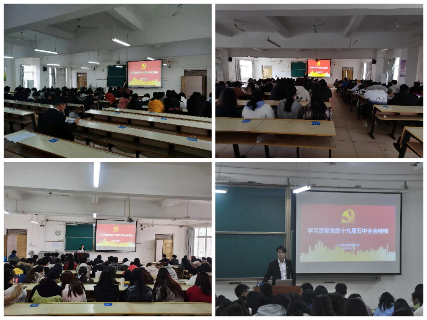 为了深入学习十九届五中全会精神,2020年12月01日下午14点人文科学系党总支组织2019、2020级全体学生学习党的十九届五中全会精神。人文科学系党总支书记李国鹏同志、人文科学系本科生支部牛英萍同志以及人文科学系团总支书记郭豪同志参加本次宣讲会。