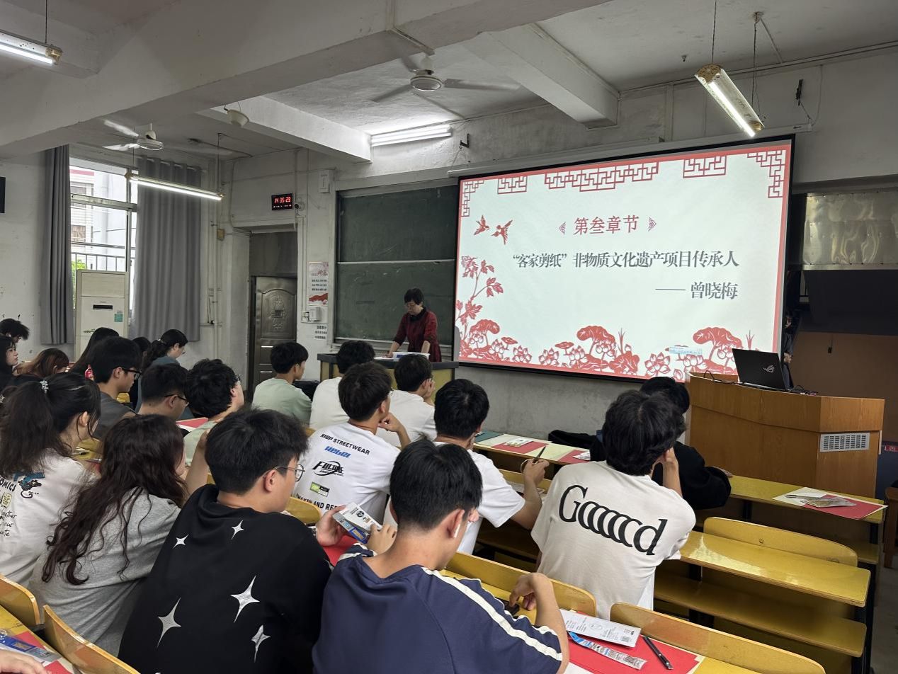 曾晓梅分享了她在剪纸艺术道路上四十多年的坚守,她对弘扬中华优秀传统文化的执着追求深深感染着同学们。她带领同学们了解了客家剪纸的基本工具、折纸技巧和剪纸技法,以及吉祥文字和图案运用等,耐心细致的指导同学们动手操作,让大家深深感受到了“赣南客家剪纸”的艺术魅力,更激发了同学们对传统文化的兴趣和参与非遗保护与传承的积极性。