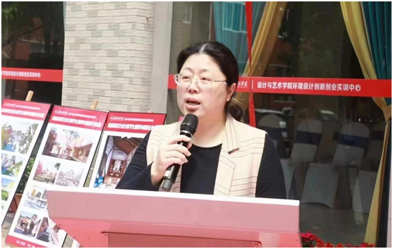 高健婕介绍了环境设计创新创业实训中心的基本情况,实训中心将环境设计专业学生必须了解的四个载体(设计公司、建材、施工工地、成品空间)都浓缩到其中,以课堂理论与实际应用相结合为出发点,采用现代化设计理念与艺术性的表现形式,共建了学习公区、材料展厅、标准施工工艺展厅、样板房展示间等4大学习区。实训中心充分发挥了校企合作、产教融合的作用以及为社会、行业、企业服务的功能,既为环境艺术专业学生实习、实训、就业提供更大空间,也为培养更多高素质、高技能,能服务于地方产业和经济发展的应用型人才打下了坚实的专业基础。