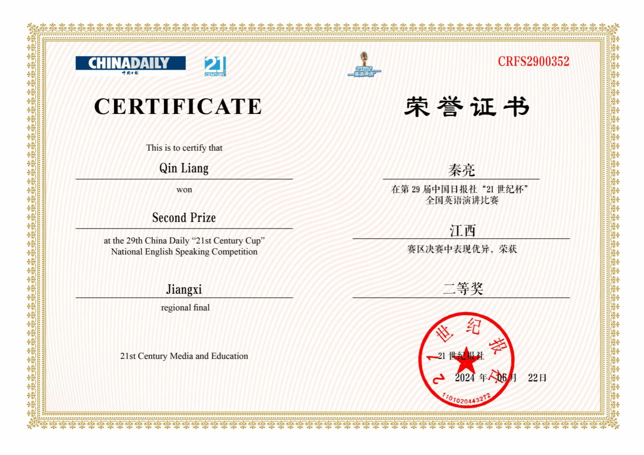 6月22日,第29届中国日报社“21 世纪杯”全国英语演讲比赛江西赛区复赛在江西农业大学顺利举行,买球体育自动化222班秦亮,英语222班邹婧乐分获江西赛区二等奖、三等奖。秦亮同学将和来自全省其它高校的九位同学代表江西赛区参加十月份在北京举办的全国半决赛。