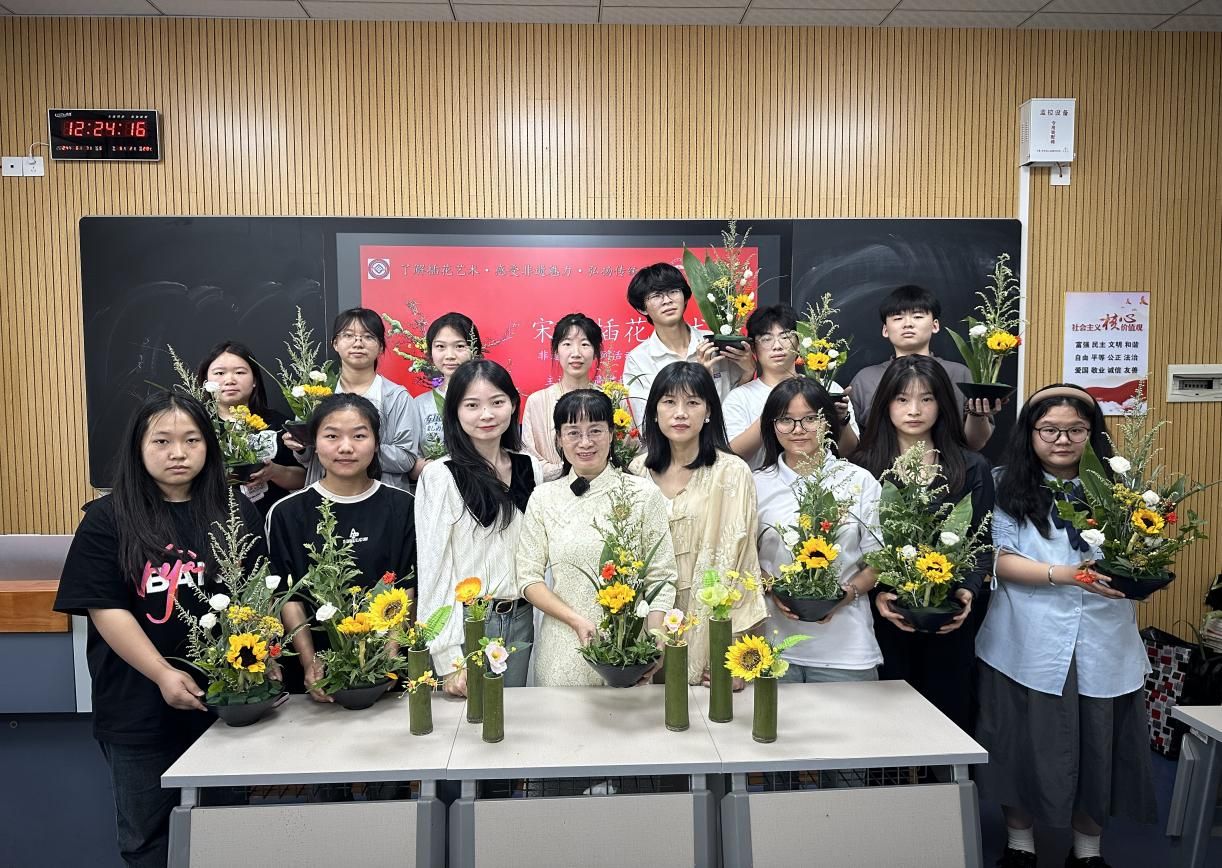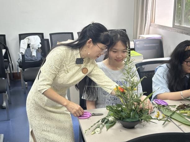 谢东琳以东西方插花文化的差异性导入本次课程的主题,通过各国插花文化的历史变迁和相互借鉴比较,激发同学们的民族自豪感。在宋代花艺体验过程中,谢老师让同学们共同协作引导大家探索“宋韵插花”的魅力。同学们通过课程不仅了解了宋代插花的人文精神,学习了宋代插花的技艺,体会了“插花是立体绘画”的含义,同时,还对宋代“平淡天真、高洁清雅”的审美价值与精神追求有了深刻认识。
