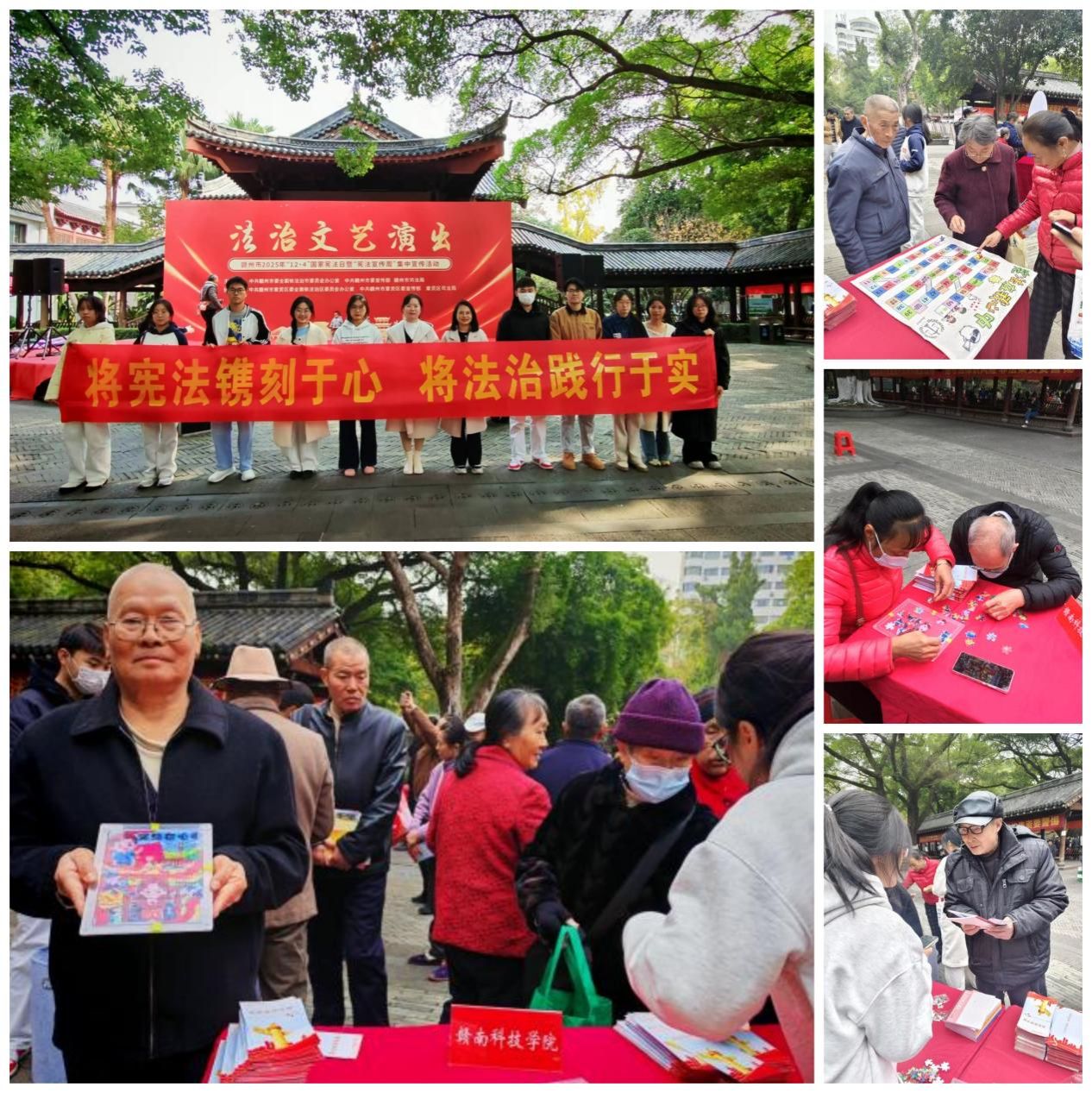 在校外联动方面,12月4日上午,普法社师生代表应赣州市司法局邀请,参与赣州市2025年“12・4”国家宪法日集中宣传活动。在赣州公园活动现场,师生们通过布置展位、组织互动游戏、分发宣传手册、提供简易法律咨询等方式,向市民普及宪法及法律常识,将法治课堂延伸至社区,展现了高校学子传播法治文化、服务社会的责任担当。