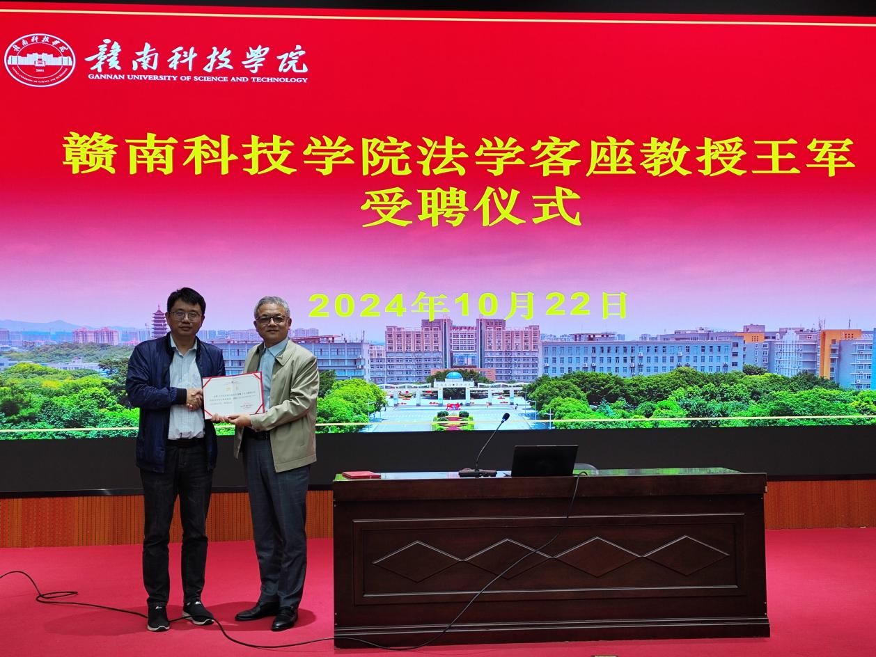 讲座后,举行了买球体育官方网站法学客座教授受聘仪式,买球体育官方网站教学主任何建军为新聘任的客座教授王军颁发聘书。