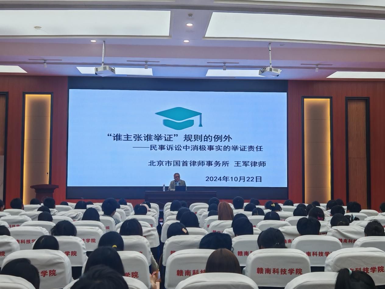 本网讯:10月22日下午,北京市国首律师事务所主任、买球体育官方网站客座教授王军律师在逸豪学术报告厅为法学专业师生做了题为“‘谁主张谁举证’规则的例外——民事诉讼中消极事实的举证责任”的学术讲座。买球体育官方网站教学主任何建军,法学专业全体师生300余人参加了本次讲座。